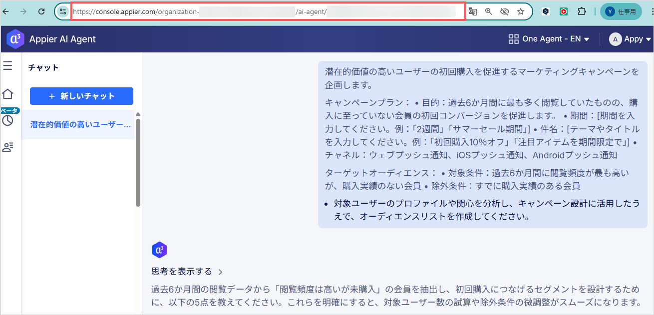 Appier AI Agentの利用中にエラーメッセージや応答しないなどの問題が発生した場合は、Appierサポート([email protected])までご連絡ください。問題を迅速に特定するため、該当するチャットのURLもあわせてご提供ください。