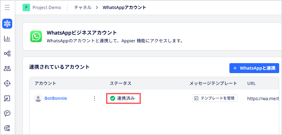 連携が確認できたら、ユーザーとのエンゲージメントを開始できます。配信 機能を使用してビジネス発信メッセージを送信するには、メッセージテンプレートの作成 手順に従ってください。