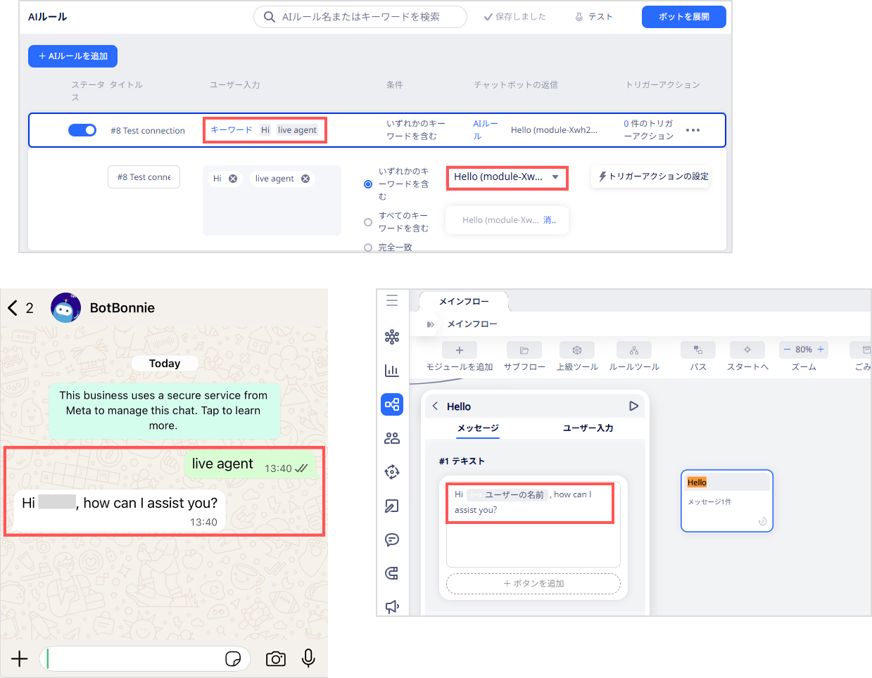 連携をテストするには、AIルール を作成し、指定したキーワードを含むメッセージWhatsAppアカウントに送信します。WhatsAppアカウントが正常に連携されている場合、設定した返信モジュールが届きます。