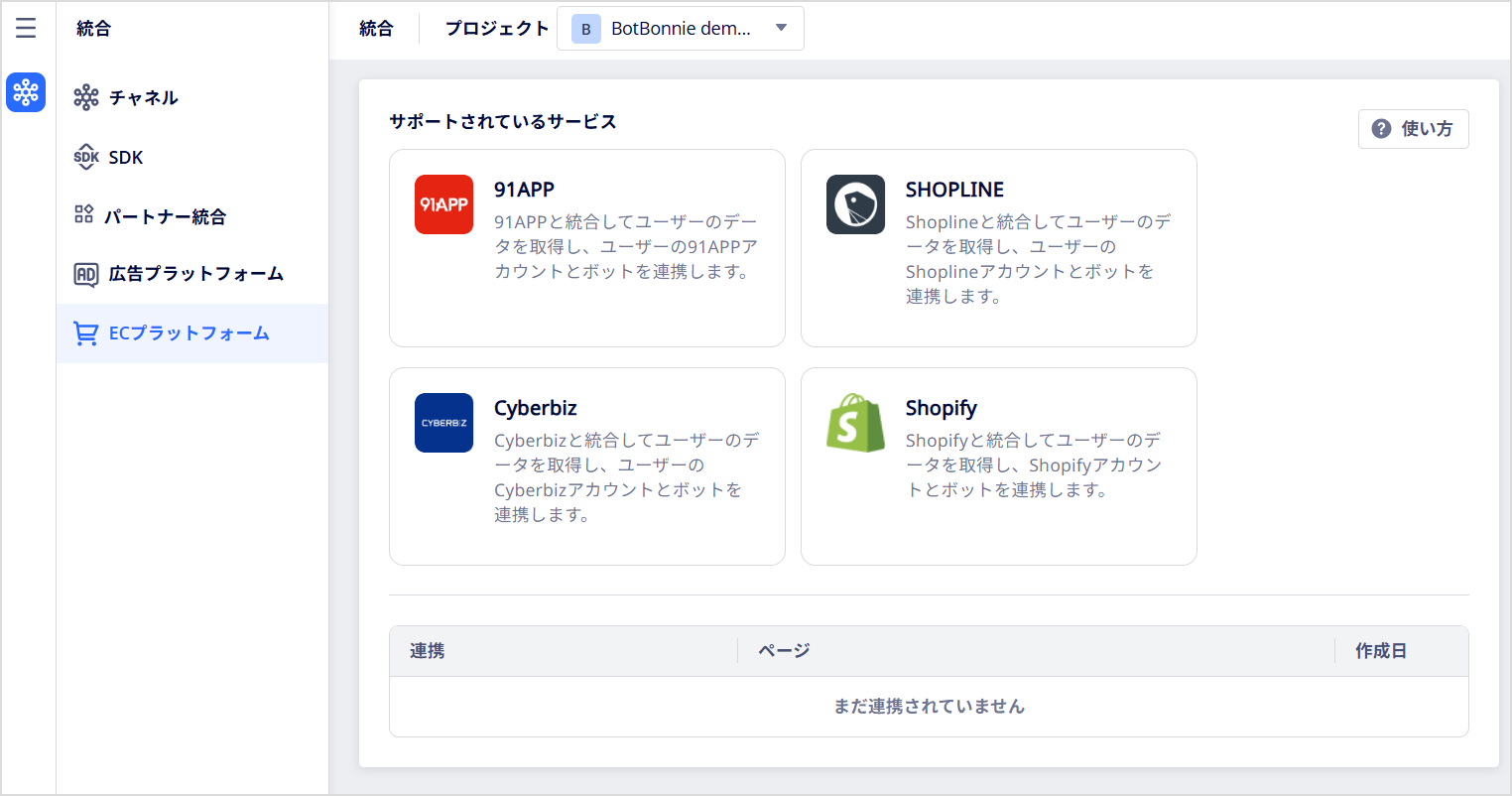 以下からご利用のEコマースプラットフォームを選択し、コネクションの設定を開始します。