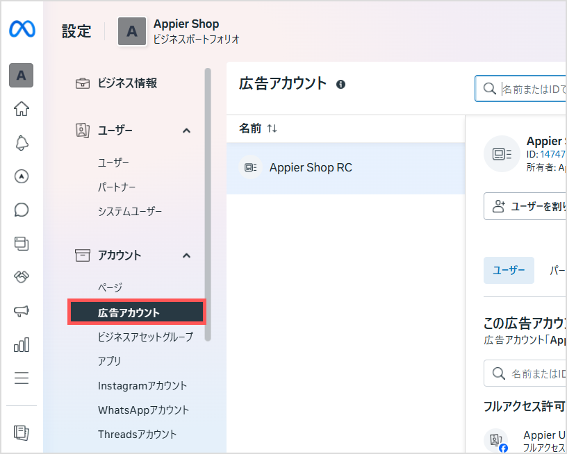- 設定ビジネス設定ページの左メニューで、[広告アカウント] を選択します。