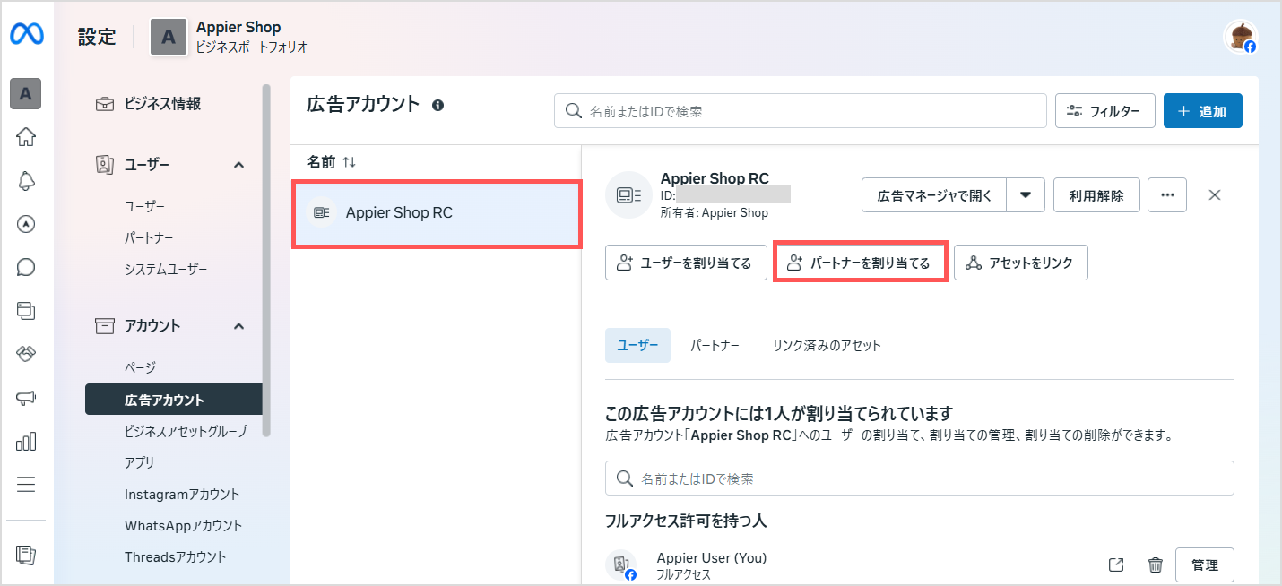 Meta Business Suiteアカウントで、Appierをビジネスパートナーとして追加します。