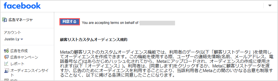 [Ad_Account_ID] を使用中の広告アカウントの実際のIDと置き換えます。(www.facebook.com/ads/manage/customaudiences/tos/?act=[Ad_Account_ID])