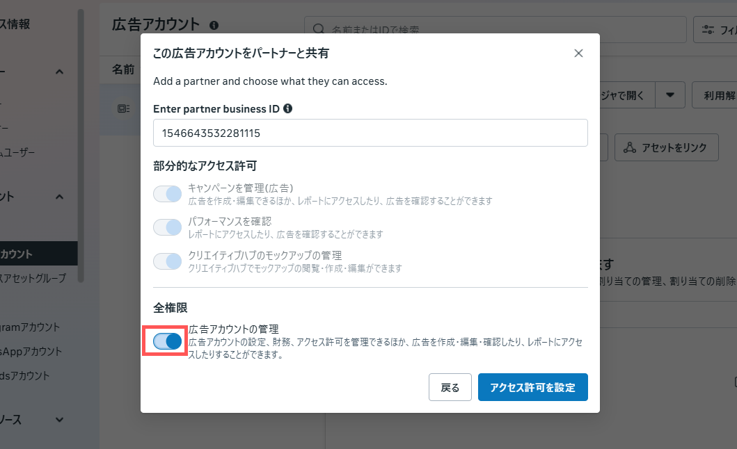 - [全権限] の [広告アカウントの管理] を許可し、[アクセス許可を設定] をクリックします。