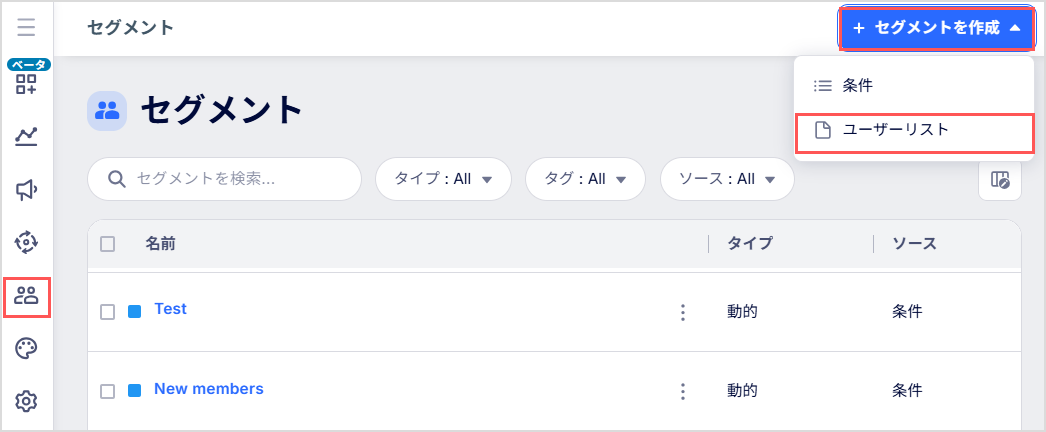 CSVファイルをアップロードしてユーザーIDのリストをマッピングし、セグメントを作成するには、[+ セグメントを作成] → [ユーザーリスト] をクリックします。