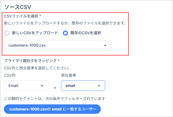 [ソースCSV] で、新しいユーザーファイルをアップロードするか、既存のファイルを選択します。CSVファイルの最大サイズは50MBです。
