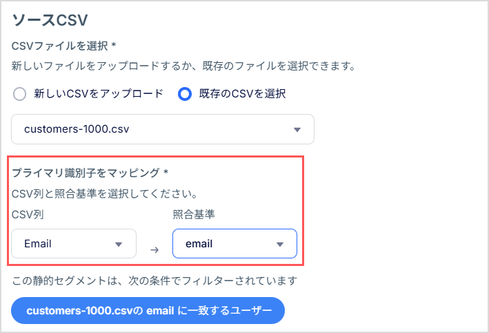 [プライマリ識別子をマッピング] で、CSV内のプライマリユーザーIDを含む列を、プロジェクトの既存データベース内の対応する属性にマッピングします。