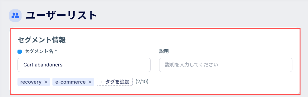 [セグメント情報] では、セグメント名、説明(任意)、タグ(任意)を入力します。