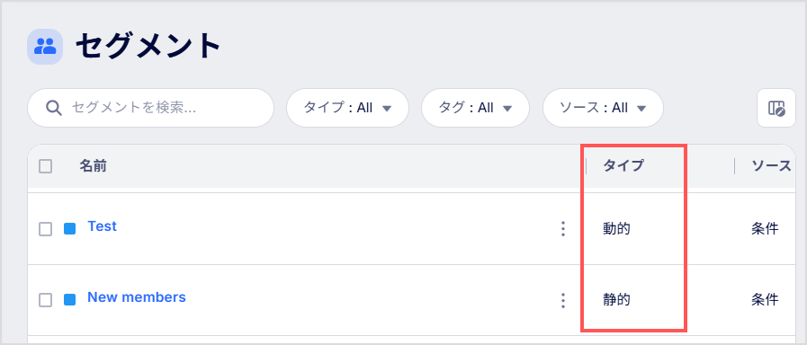 セグメントタイプ は、セグメントが自動的に更新されるかどうかを定義します。セグメントのソース は、セグメントの作成方法を示します。これらの2つの要素により、セグメントの更新方法と更新タイミングが決まります。