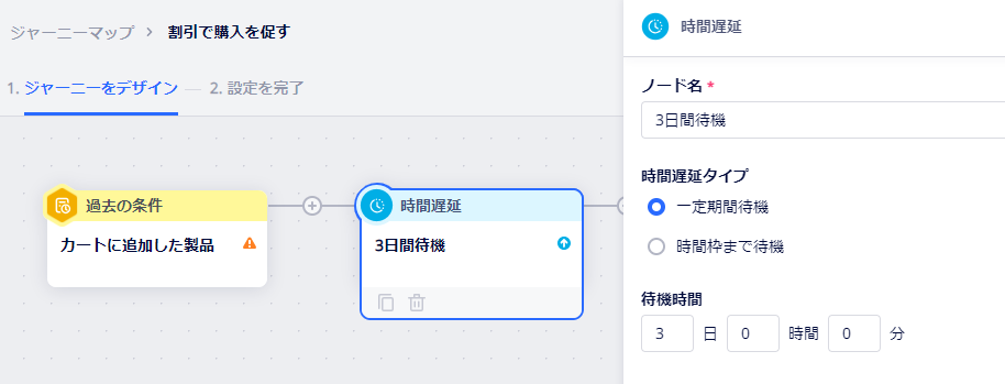 - 一定期間待機:一定の時間が経過すると、ユーザーはジャーニーマップ内の次のノードに移動します。[待機時間] で、待機時間を設定します。