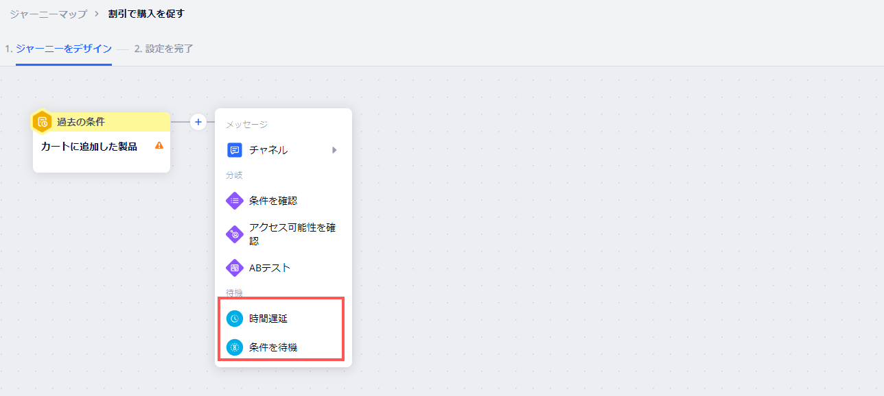 待機ノードを追加するには、ノード間のポイントをクリックし、[時間遅延] を選択します。